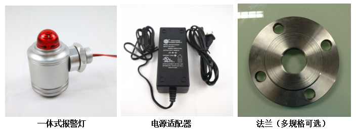 选配附件 一体式声光报警器、分体式声光报警器、24V直流稳压电源、连电脑监控的配件:上位机软件、RS485/RS232转换器、 USB/RS232 转换连接线、 TCP/IP转换器